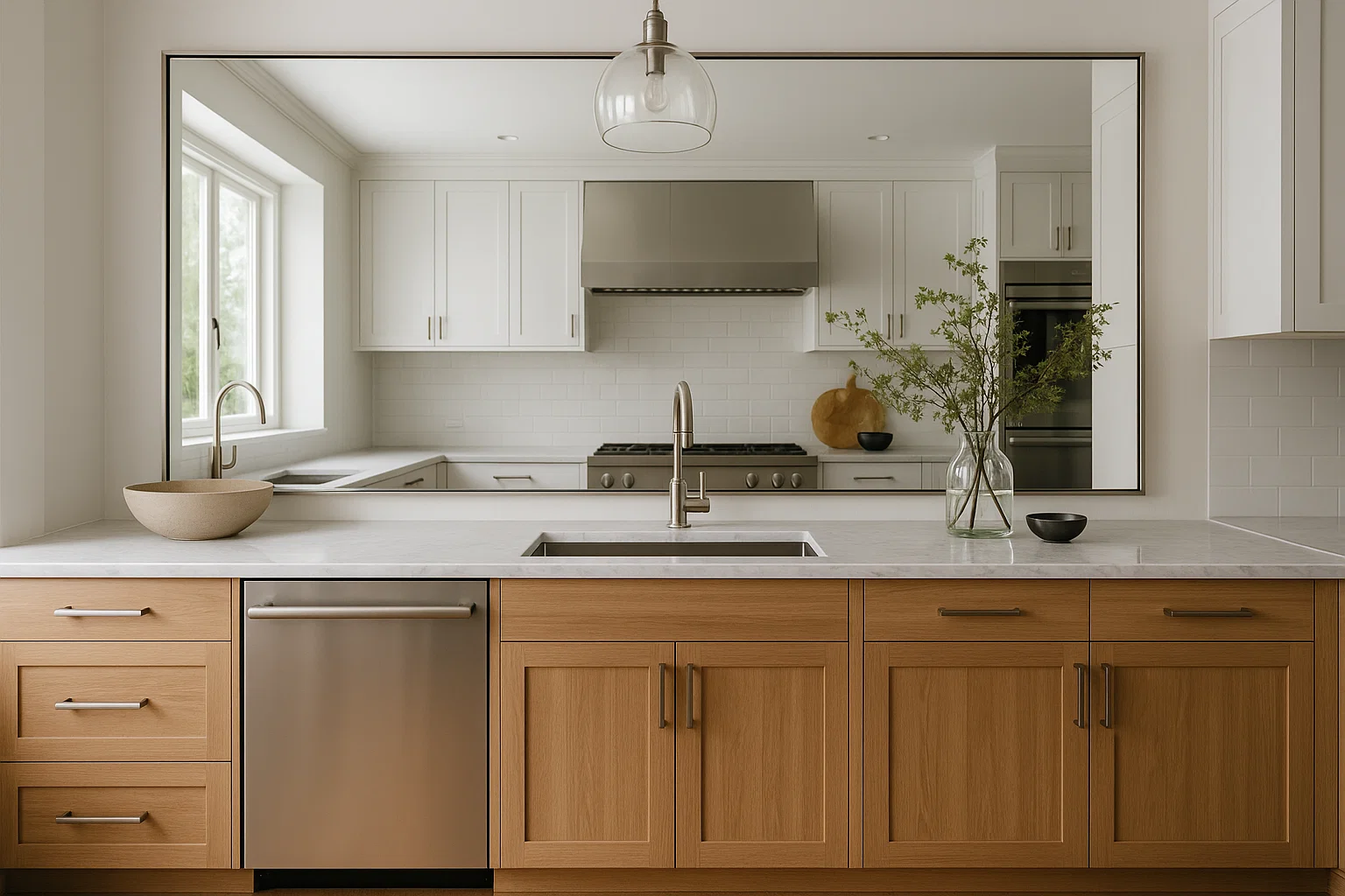 Aynalar, ışığı yansıtarak küçük alanları daha büyük gösterme konusunda oldukça etkilidir. Mutfakta bir duvarda büyük bir ayna kullanarak, alanın derinliğini artırabilirsiniz. Aynalar, sadece ferahlatıcı bir etki sağlamakla kalmaz, aynı zamanda mutfakta şık bir dekoratif unsur oluşturur.