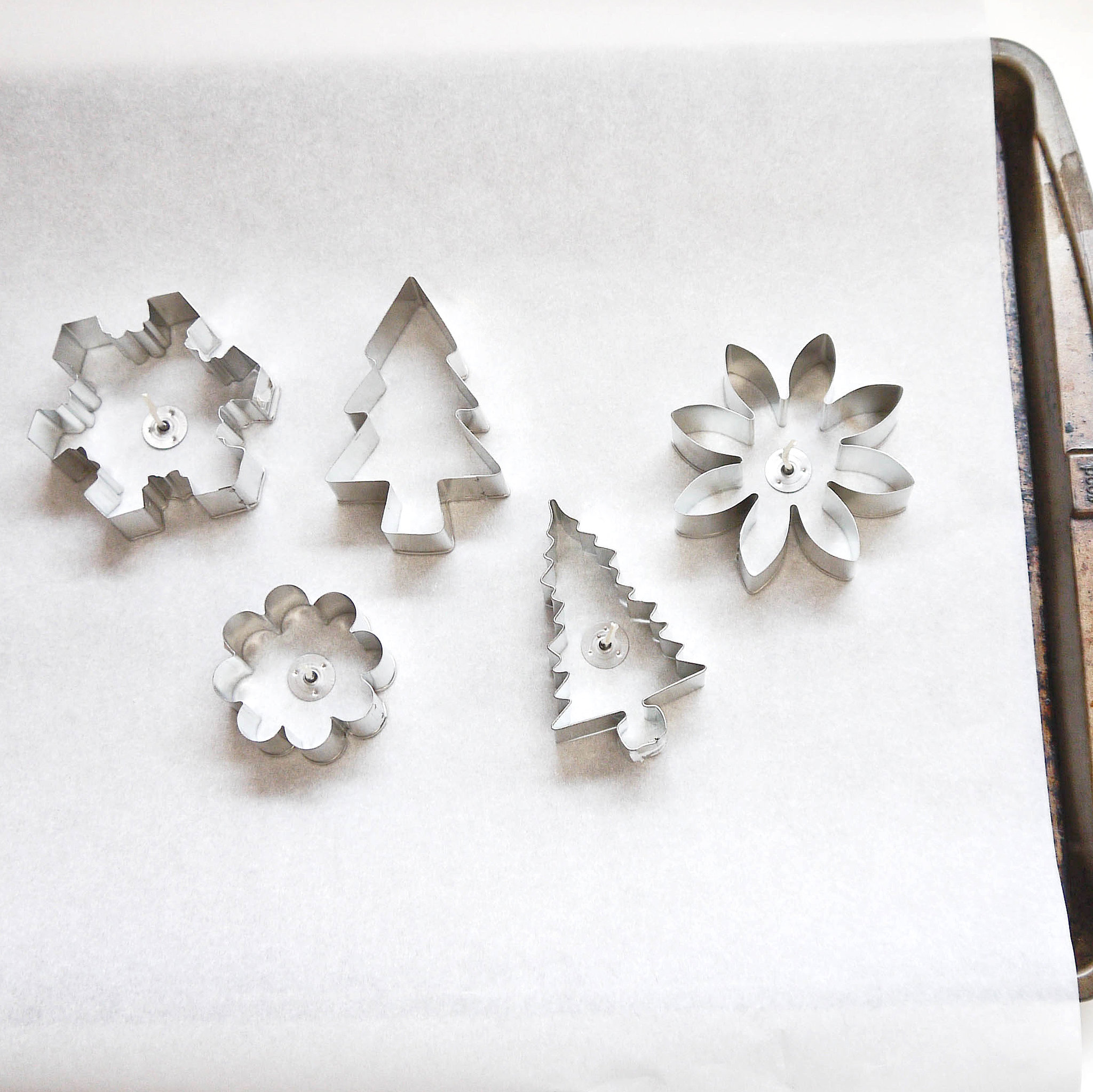 2. Kurabiye kalıplarımızı bir tepsi içerisine yerleştirelim. Tepsinin üzerine yanmaz kağıt serelim. Kalıpların içersine ise fitillerimizi yerleştirelim.