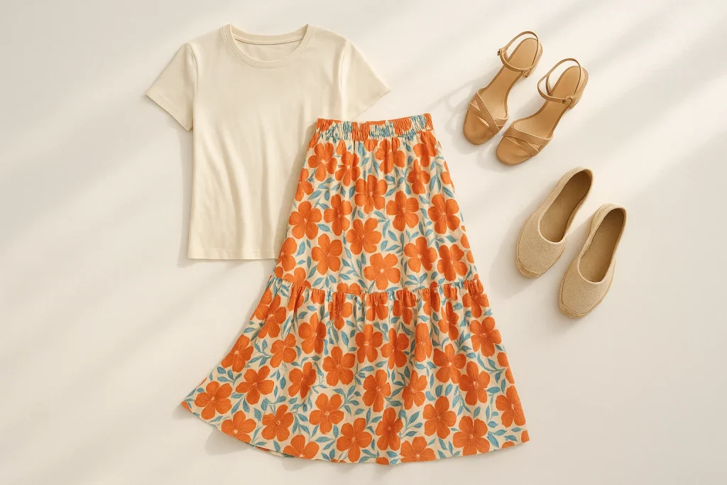 - Şık bir topuklu sandalet veya rahat bir espadrille ile görünümünüzü tamamlayın.