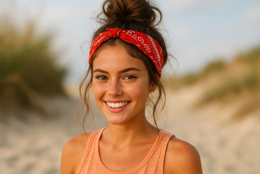 Eğer enerjik ve genç bir stil seviyorsan, bandana ile tamamlanan yaz topuzunu denemelisin. Bu model, tatil ve festivaller için biçilmiş kaftandır.