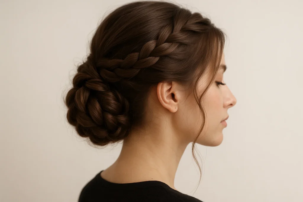 Saçını iki yandan ör ve arkada birleştirerek düşük topuz oluştur. Örgüleri topuzun çevresine dolayarak sabitle. Tokalarla tuttur ve spreyle son dokunuşu yap.